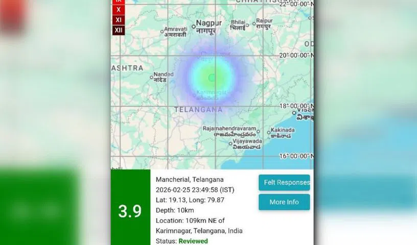A mild earthquake measuring 3.9 on the Richter Scale struck near Mancherial late Wednesday night, causing panic in bordering regions of Maharashtra and Telangana. According to the National Centre for Seismology, the tremor occurred at around 11:49 PM at a depth of 10 km.
