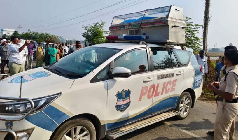 A private travels bus rammed into a car at Mahalingapuram near Shankarpally on Friday morning, pushing the vehicle off the road and triggering a fire. Locals rushed to rescue the driver, who escaped without injuries. Police have registered a case and begun investigations.