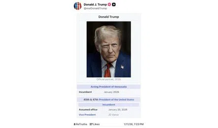 US President Donald Trump shared a digitally altered image on social media portraying himself as the “Acting President of Venezuela.” The image appeared to mimic an edited Wikipedia page, listing Trump as the incumbent Venezuelan president as of January 2026, alongside his official roles as the 45th and 47th President of the United States. The post is not linked to any official appointment or constitutional role.