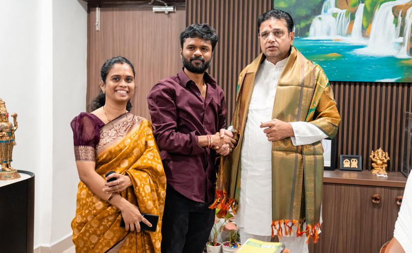 Soon after his arrival, Sandeep Maktala, accompanied by his wife Bhagyalakshmi, paid a courtesy visit to Telangana IT & Industries Minister Sridhar Babu at his residence. He expressed heartfelt gratitude to the Telangana government, noting that meeting the Minister as his first official engagement on return reflected his deep respect and connection to the state.